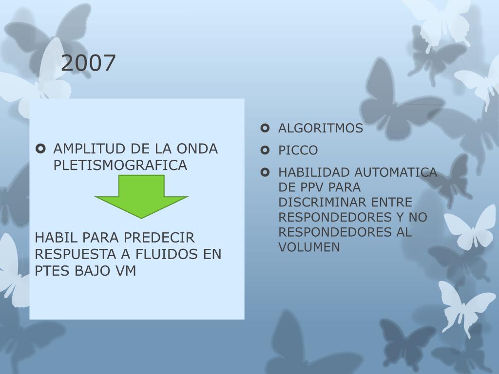 2007 • AMPLITUD DE LA ONDA PLETISMOGRAFICA HABIL PARA PREDECIR RESPUESTA A FLUIDOS EN PTES BAJO VM • ALGORITMOS • PICCO • HABILIDAD AUTOMATICA DE PPV PARA DISCRIMINAR ENTRE RESPONDEDORES Y NO RESPONDEDORES AL VOLUMEN