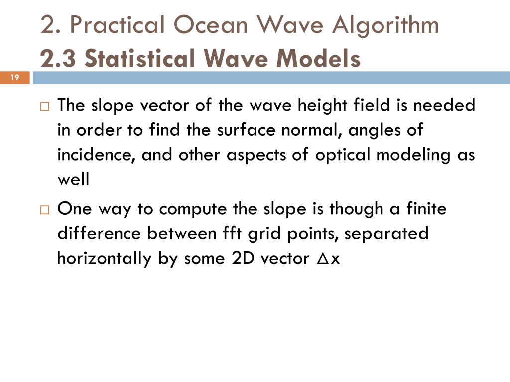 2. Practical Ocean Wave Algorithm 2.3 Statistical Wave Models • The slope vector of the wave height field is needed in order to find the surface normal, angles of incidence, and other aspects of optical modeling as well • One way to compute the slope is though a finite difference between fft grid points, separated horizontally by some 2D vector △x