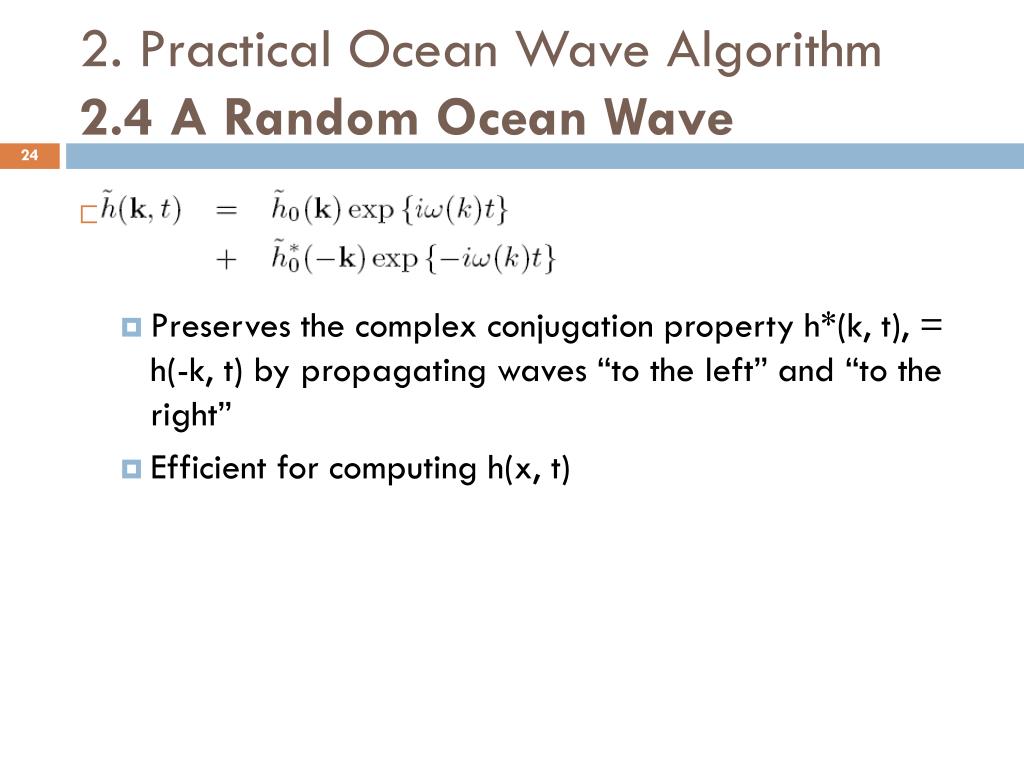 2. Practical Ocean Wave Algorithm2.4 A Random Ocean Wave • Preserves the complex conjugation property h*(k, t), = h(-k, t) by propagating waves “to the left” and “to the right” • Efficient for computing h(x, t)