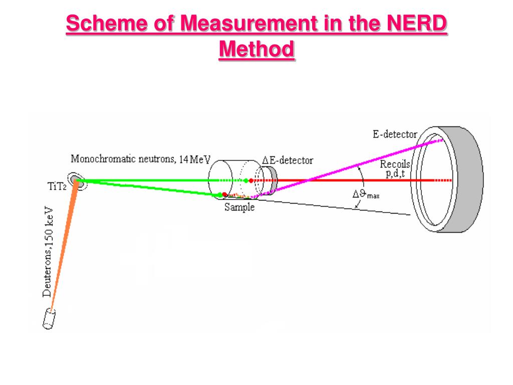 Principle of the Neutron–induced Recoil Detection (NERD) Method • The depth profiles of hydrogen isotopes concentration in materials are obtained from the energy spectra of the recoiled hydrogen nuclei induced by fast monochromatic neutron flux. • The relation between the concentration profile C(x) and the energy spectra N(E) of the recoiler nuclei can be roughly presented as: C(x) ~ N(E)(dE/dx)/nH HerenHis the cross section of the (n,H) elastic scattering and dE/dxis thespecific energy loss.