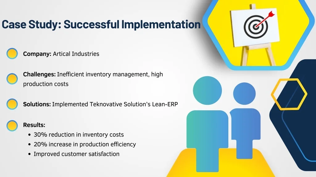 Case Study: Successful Implementation Company: Artical Industries Challenges: Inefficient inventory management, high production costs Solutions: Implemented Teknovative Solution’s Lean-ERP Results: 30% reduction in inventory costs 20% increase in production efficiency Improved customer satisfaction