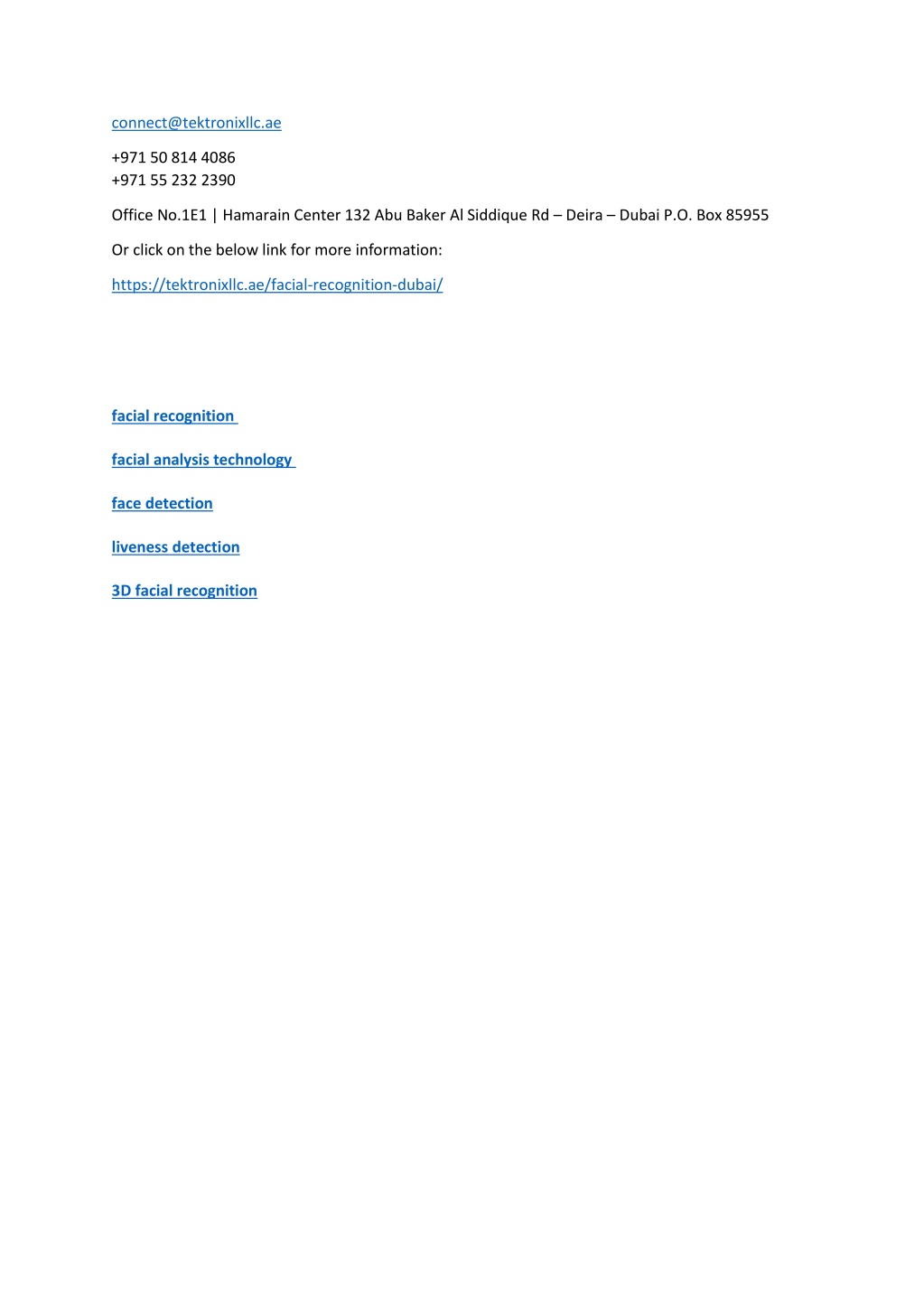 connect@tektronixllc.ae +971 50 814 4086 +971 55 232 2390 Office No.1E1 | Hamarain Center 132 Abu Baker Al Siddique Rd – Deira – Dubai P.O. Box 85955 Or click on the below link for more information: https://tektronixllc.ae/facial-recognition-dubai/ facial recognition facial analysis technology face detection liveness detection 3D facial recognition