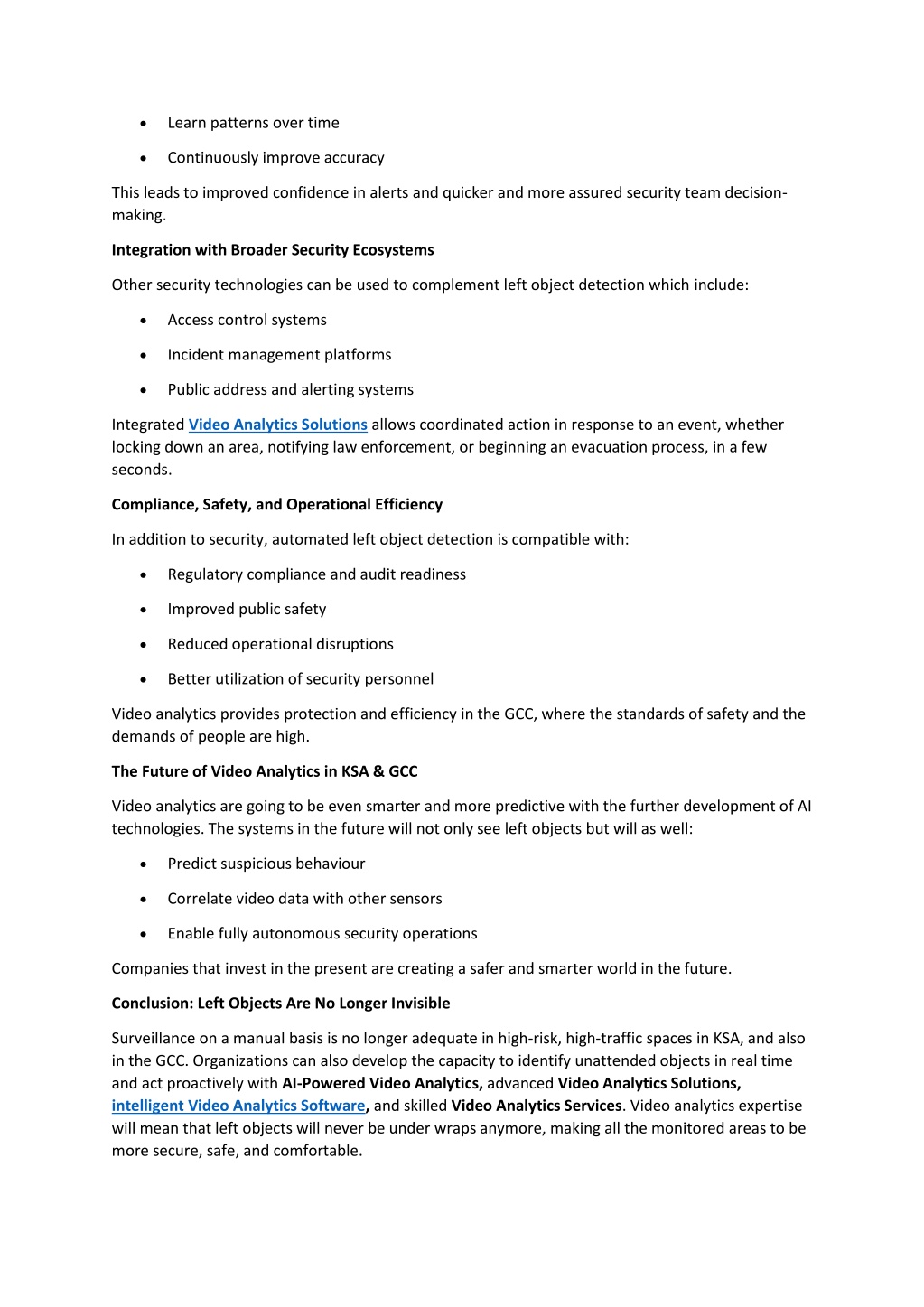• Learn patterns over time • Continuously improve accuracy This leads to improved confidence in alerts and quicker and more assured security team decision- making. Integration with Broader Security Ecosystems Other security technologies can be used to complement left object detection which include: • Access control systems • Incident management platforms • Public address and alerting systems Integrated Video Analytics Solutions allows coordinated action in response to an event, whether locking down an area, notifying law enforcement, or beginning an evacuation process, in a few seconds. Compliance, Safety, and Operational Efficiency In addition to security, automated left object detection is compatible with: • Regulatory compliance and audit readiness • Improved public safety • Reduced operational disruptions • Better utilization of security personnel Video analytics provides protection and efficiency in the GCC, where the standards of safety and the demands of people are high. The Future of Video Analytics in KSA & GCC Video analytics are going to be even smarter and more predictive with the further development of AI technologies. The systems in the future will not only see left objects but will as well: • Predict suspicious behaviour • Correlate video data with other sensors • Enable fully autonomous security operations Companies that invest in the present are creating a safer and smarter world in the future. Conclusion: Left Objects Are No Longer Invisible Surveillance on a manual basis is no longer adequate in high-risk, high-traffic spaces in KSA, and also in the GCC. Organizations can also develop the capacity to identify unattended objects in real time and act proactively with AI-Powered Video Analytics, advanced Video Analytics Solutions, intelligent Video Analytics Software, and skilled Video Analytics Services. Video analytics expertise will mean that left objects will never be under wraps anymore, making all the monitored areas to be more secure, safe, and comfortable.