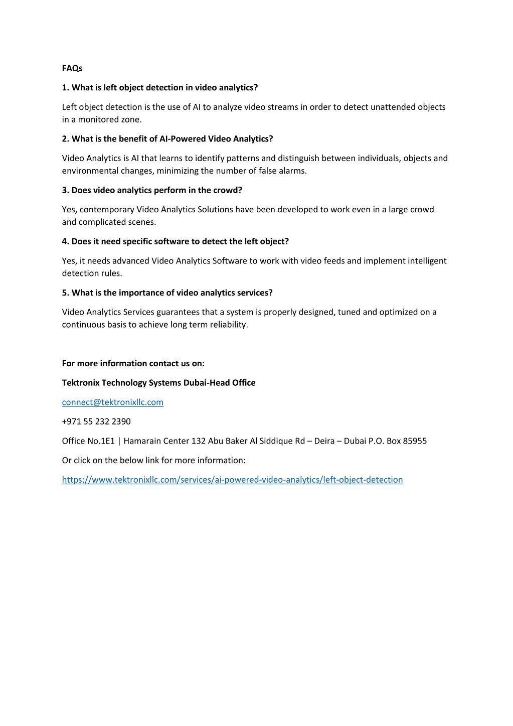 FAQs 1. What is left object detection in video analytics? Left object detection is the use of AI to analyze video streams in order to detect unattended objects in a monitored zone. 2. What is the benefit of AI-Powered Video Analytics? Video Analytics is AI that learns to identify patterns and distinguish between individuals, objects and environmental changes, minimizing the number of false alarms. 3. Does video analytics perform in the crowd? Yes, contemporary Video Analytics Solutions have been developed to work even in a large crowd and complicated scenes. 4. Does it need specific software to detect the left object? Yes, it needs advanced Video Analytics Software to work with video feeds and implement intelligent detection rules. 5. What is the importance of video analytics services? Video Analytics Services guarantees that a system is properly designed, tuned and optimized on a continuous basis to achieve long term reliability. For more information contact us on: Tektronix Technology Systems Dubai-Head Office connect@tektronixllc.com +971 55 232 2390 Office No.1E1 | Hamarain Center 132 Abu Baker Al Siddique Rd – Deira – Dubai P.O. Box 85955 Or click on the below link for more information: https://www.tektronixllc.com/services/ai-powered-video-analytics/left-object-detection