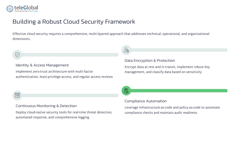 Building a Robust Cloud Security Framework Effective cloud security requires a comprehensive, multi-layered approach that addresses technical, operational, and organizational dimensions. Data Encryption & Protection Encrypt data at rest and in transit, implement robust key management, and classify data based on sensitivity Identity & Access Management Implement zero-trust architecture with multi-factor authentication, least-privilege access, and regular access reviews Compliance Automation Leverage infrastructure-as-code and policy-as-code to automate compliance checks and maintain audit readiness Continuous Monitoring & Detection Deploy cloud-native security tools for real-time threat detection, automated response, and comprehensive logging
