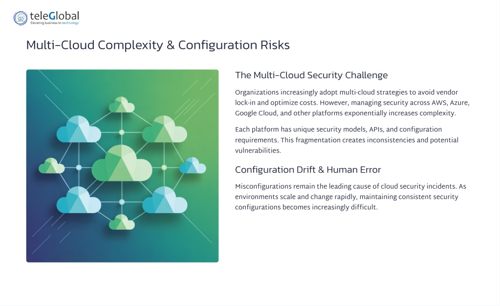 Multi-Cloud Complexity & Configuration Risks The Multi-Cloud Security Challenge Organizations increasingly adopt multi-cloud strategies to avoid vendor lock-in and optimize costs. However, managing security across AWS, Azure, Google Cloud, and other platforms exponentially increases complexity. Each platform has unique security models, APIs, and configuration requirements. This fragmentation creates inconsistencies and potential vulnerabilities. Configuration Drift & Human Error Misconfigurations remain the leading cause of cloud security incidents. As environments scale and change rapidly, maintaining consistent security configurations becomes increasingly difficult.