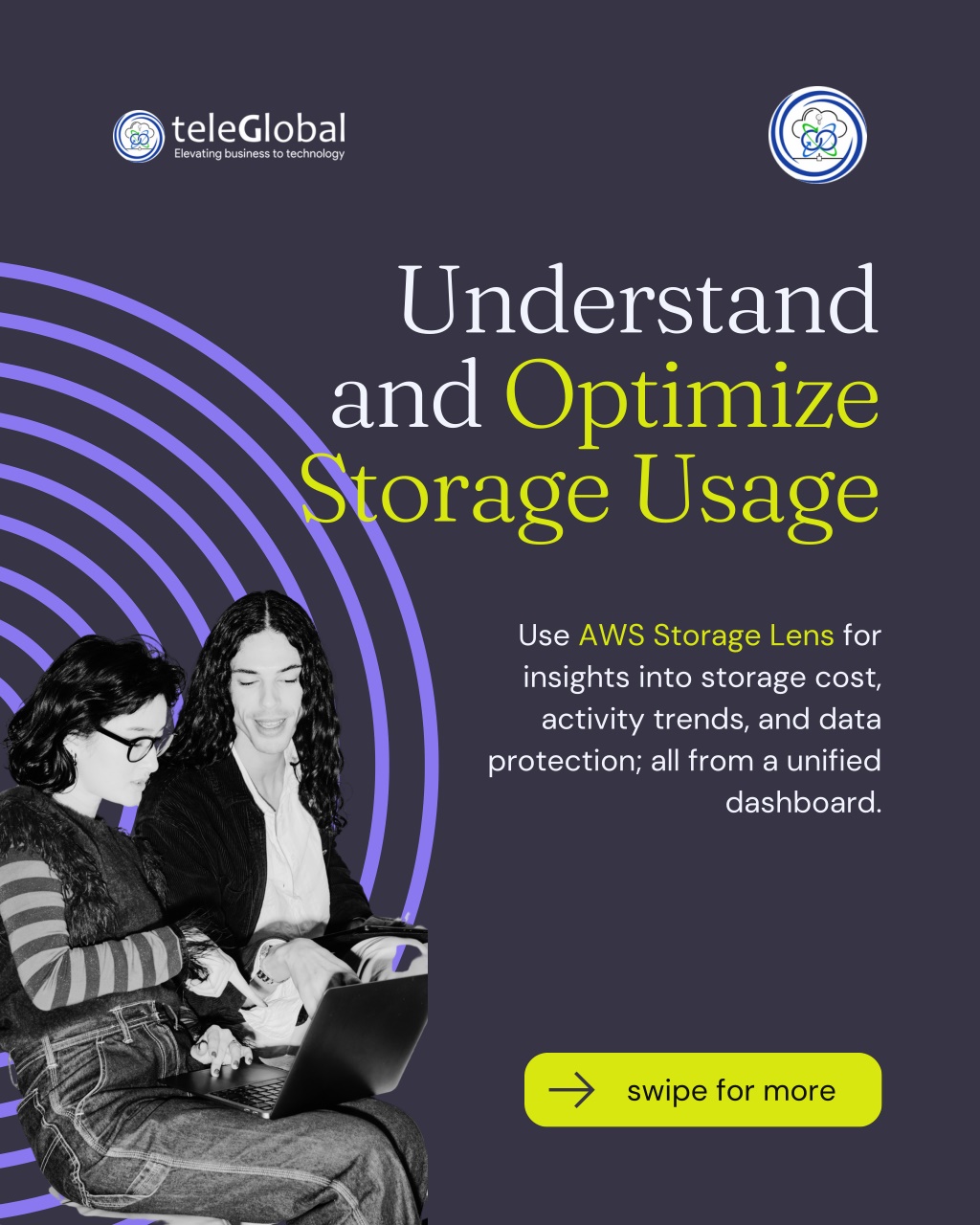 Understand and Optimize Storage Usage Use AWS Storage Lens for insights into storage cost, activity trends, and data protection; all from a unified dashboard. swipe for more