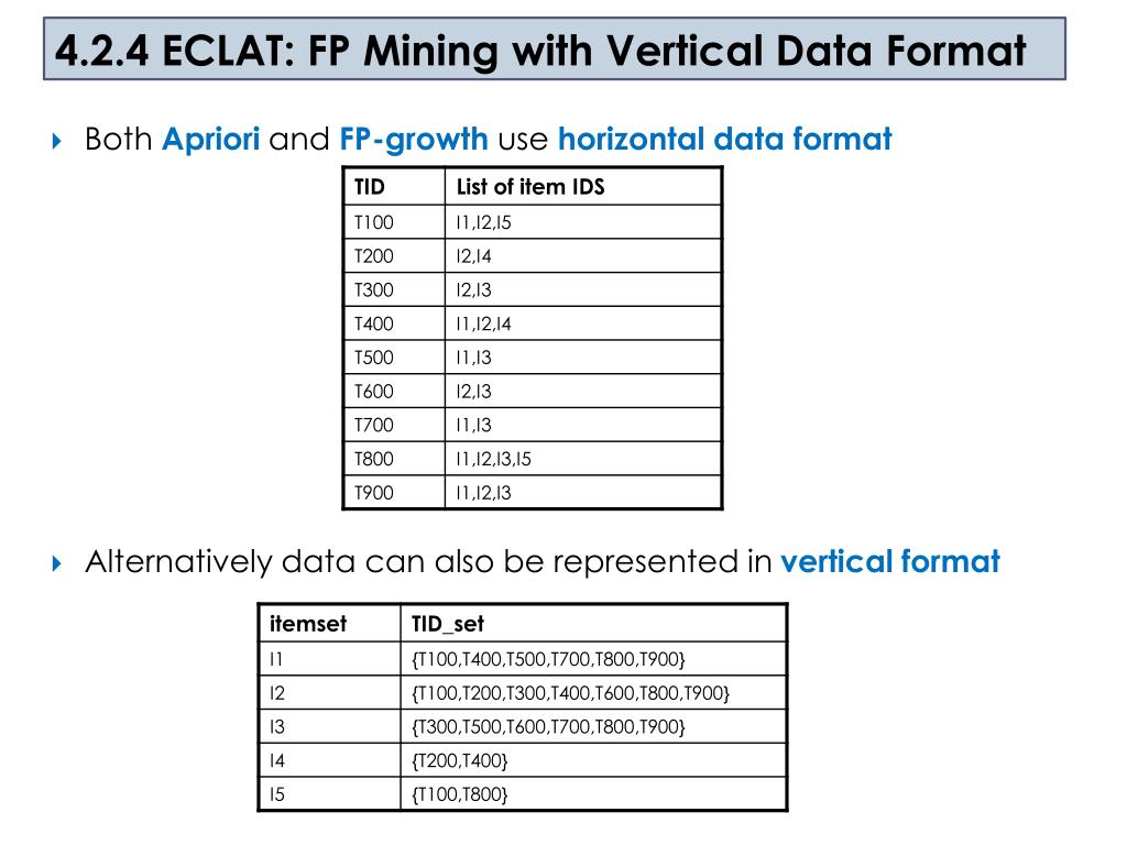 4.2.4 ECLAT: FP Mining with Vertical Data Format • Both Apriori and FP-growth use horizontal data format • Alternatively data can also be represented in vertical format