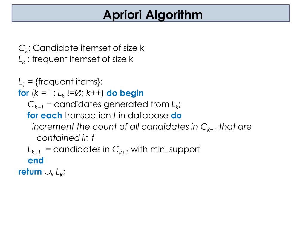 Apriori Algorithm Ck: Candidate itemset of size k Lk : frequent itemset of size k L1 = {frequent items}; for(k = 1; Lk !=; k++) do begin Ck+1 = candidates generated from Lk; for each transaction t in database do increment the count of all candidates in Ck+1 that are contained in t Lk+1 = candidates in Ck+1 with min_support end returnkLk;