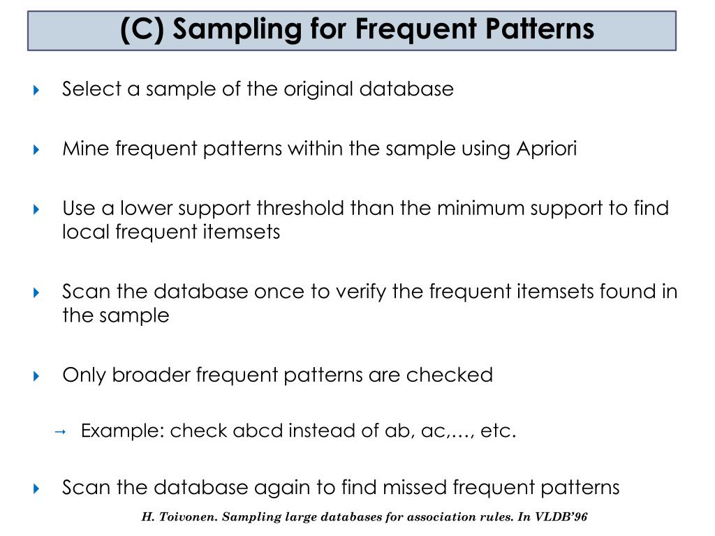 (C) Sampling for Frequent Patterns • Select a sample of the original database • Mine frequent patterns within the sample using Apriori • Use a lower support threshold than the minimum support to find local frequent itemsets • Scan the database once to verify the frequent itemsets found in the sample • Only broader frequent patterns are checked • Example: check abcd instead of ab, ac,…, etc. • Scan the database again to find missed frequent patterns H. Toivonen. Sampling large databases for association rules. In VLDB’96