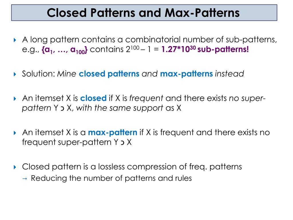 Closed Patterns and Max-Patterns • A long pattern contains a combinatorial number of sub-patterns, e.g., {a1, …, a100}contains 2100 – 1 = 1.27*1030 sub-patterns! • Solution: Mine closed patterns and max-patterns instead • An itemset Xis closedif X is frequent and there exists no super-pattern Y כ X, with the same support as X • An itemset X is a max-pattern if X is frequent and there exists no frequent super-pattern Y כ X • Closed pattern is a lossless compression of freq. patterns • Reducing the number of patterns and rules