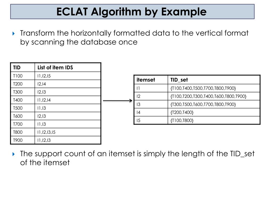 ECLAT Algorithm by Example • Transform the horizontally formatted data to the vertical format by scanning the database once • The support count of an itemset is simply the length of the TID_set of the itemset