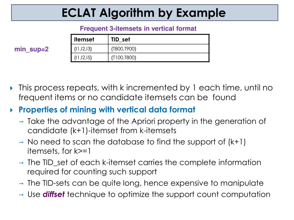 ECLAT Algorithm by Example Frequent 1-itemsets in vertical format • The frequent k-itemsets can be used to construct the candidate (k+1)-itemsets based on the Apriori property min_sup=2 Frequent 2-itemsets in vertical format