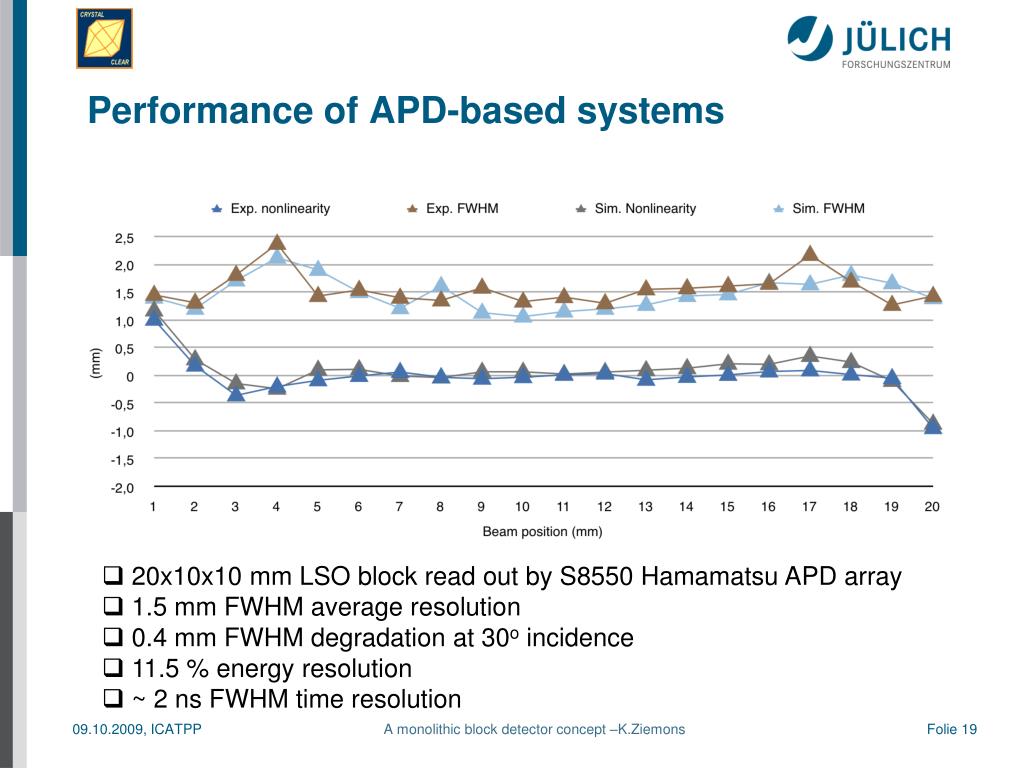Performance of APD-based systems • 20x10x10 mm LSO block read out by S8550 Hamamatsu APD array • 1.5 mm FWHM average resolution • 0.4 mm FWHM degradation at 30o incidence • 11.5 % energy resolution • ~ 2 ns FWHM time resolution