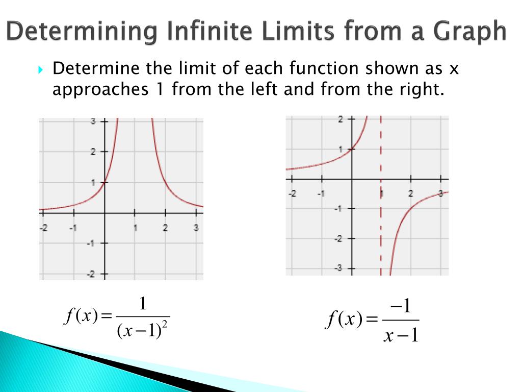 Determining Infinite Limits from a Graph • Determine the limit of each function shown as x approaches 1 from the left and from the right.