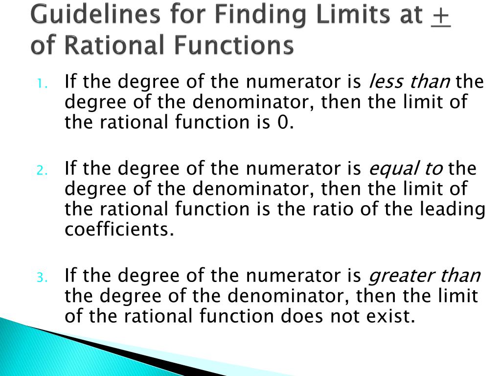 Guidelines for Finding Limits at + of Rational Functions • If the degree of the numerator is less than the degree of the denominator, then the limit of the rational function is 0. • If the degree of the numerator is equal to the degree of the denominator, then the limit of the rational function is the ratio of the leading coefficients. • If the degree of the numerator is greater thanthe degree of the denominator, then the limit of the rational function does not exist.
