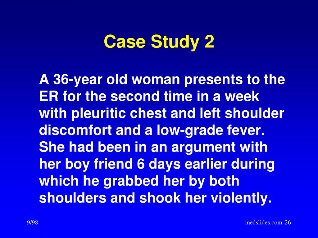 Case Study 2 A 36-year old woman presents to the ER for the second time in a week with pleuritic chest and left shoulder discomfort and a low-grade fever. She had been in an argument with her boy friend 6 days earlier during which he grabbed her by both shoulders and shook her violently. medslides.com