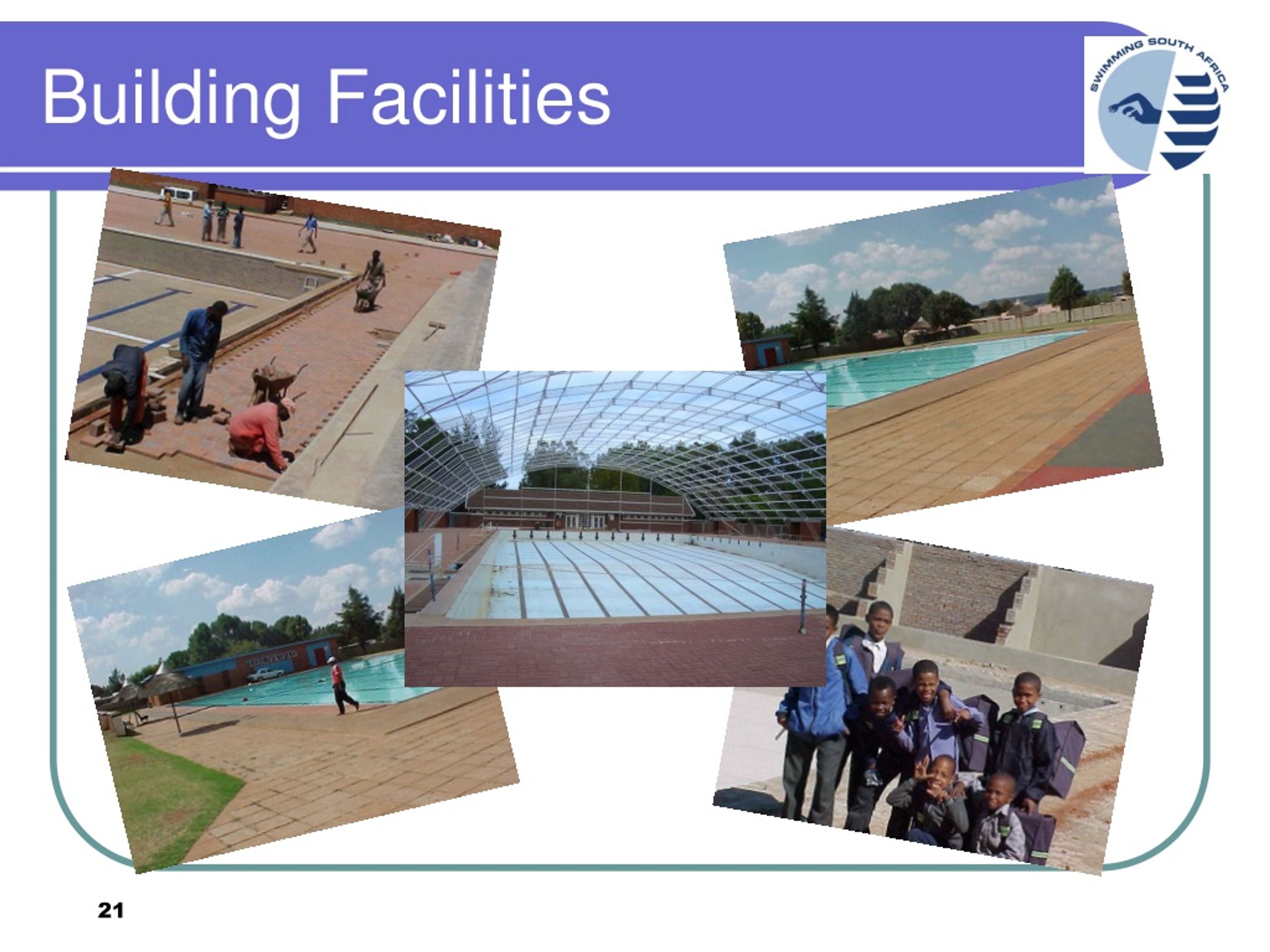 Club Development • Focused skills development of youth in identified townships at 25 facilities across the country • Renovating and heating swimming facilities in partnership with Municipalities, & Provincial Government • 7 in last 2 years; target of 50 over next 5 years? • Employment of youth at the facility to implement Learn to Swim programmes with the schools around the pool