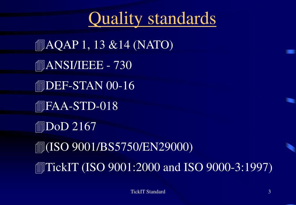 Quality standards • AQAP 1, 13 &14 (NATO) • ANSI/IEEE - 730 • DEF-STAN 00-16 • FAA-STD-018 • DoD 2167 • (ISO 9001/BS5750/EN29000) • TickIT (ISO 9001:2000 and ISO 9000-3:1997) TickIT Standard