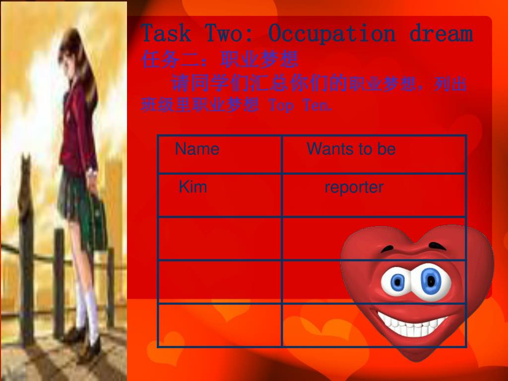 Task Two: Occupation dream 任务二:职业梦想 请同学们汇总你们的职业梦想,列出 班级里职业梦想 Top Ten.