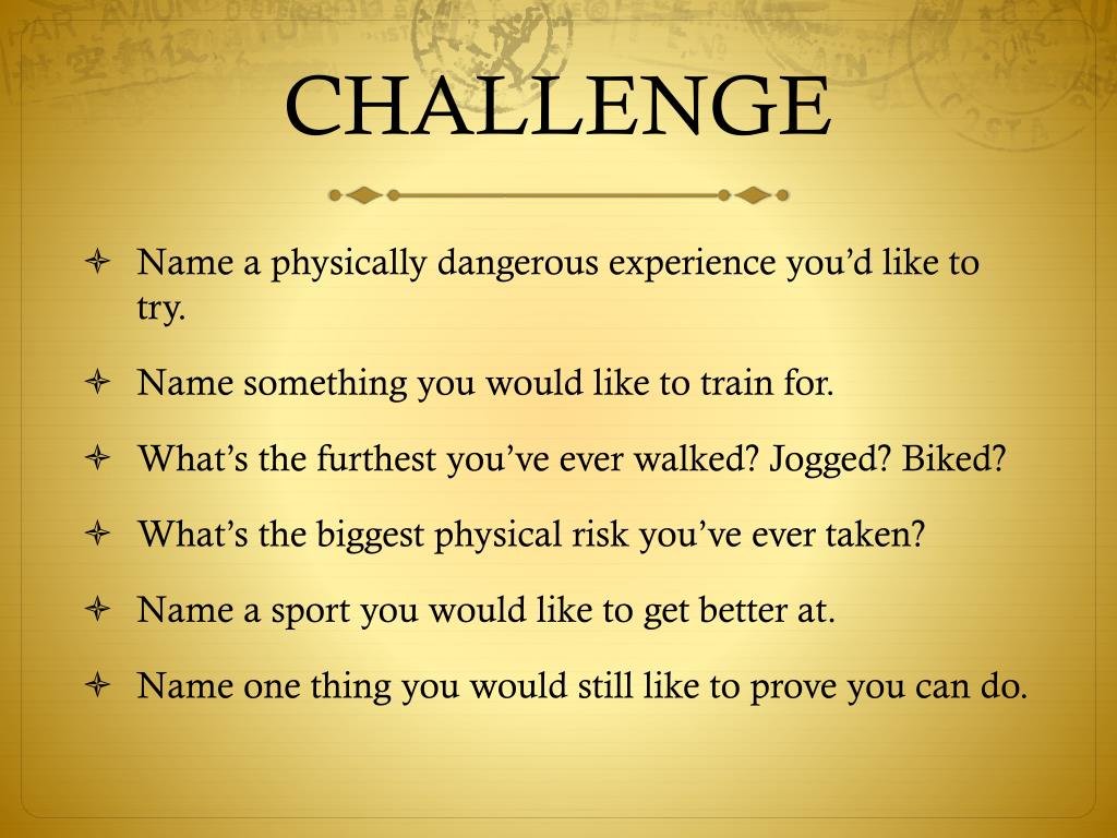 CHALLENGE Name a physically dangerous experience you’d like to try. Name something you would like to train for. What’s the furthest you’ve ever walked? Jogged? Biked? What’s the biggest physical risk you’ve ever taken? Name a sport you would like to get better at. Name one thing you would still like to prove you can do.