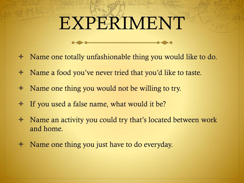 EXPERIMENT Name one totally unfashionable thing you would like to do. Name a food you’ve never tried that you’d like to taste. Name one thing you would not be willing to try. If you used a false name, what would it be? Name an activity you could try that’s located between work and home. Name one thing you just have to do everyday.