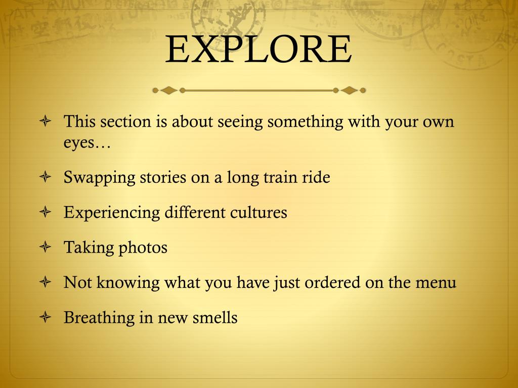 EXPLORE This section is about seeing something with your own eyes… Swapping stories on a long train ride Experiencing different cultures Taking photos Not knowing what you have just ordered on the menu Breathing in new smells