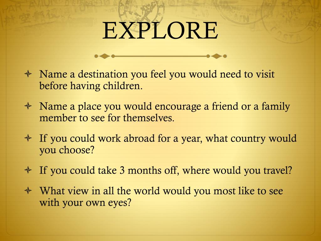 EXPLORE Name a destination you feel you would need to visit before having children. Name a place you would encourage a friend or a family member to see for themselves. If you could work abroad for a year, what country would you choose? If you could take 3 months off, where would you travel? What view in all the world would you most like to see with your own eyes?