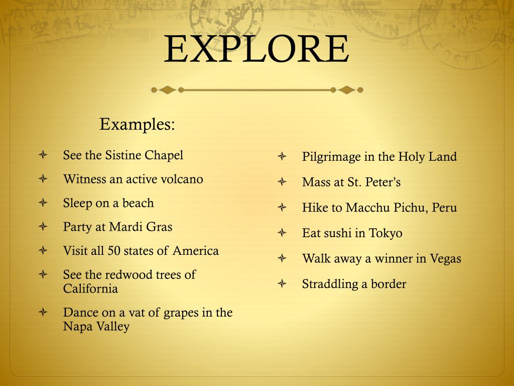 EXPLORE Examples: Pilgrimage in the Holy Land Mass at St. Peter’s Hike to MacchuPichu, Peru Eat sushi in Tokyo Walk away a winner in Vegas Straddling a border • See the Sistine Chapel • Witness an active volcano • Sleep on a beach • Party at Mardi Gras • Visit all 50 states of America • See the redwood trees of California • Dance on a vat of grapes in the Napa Valley