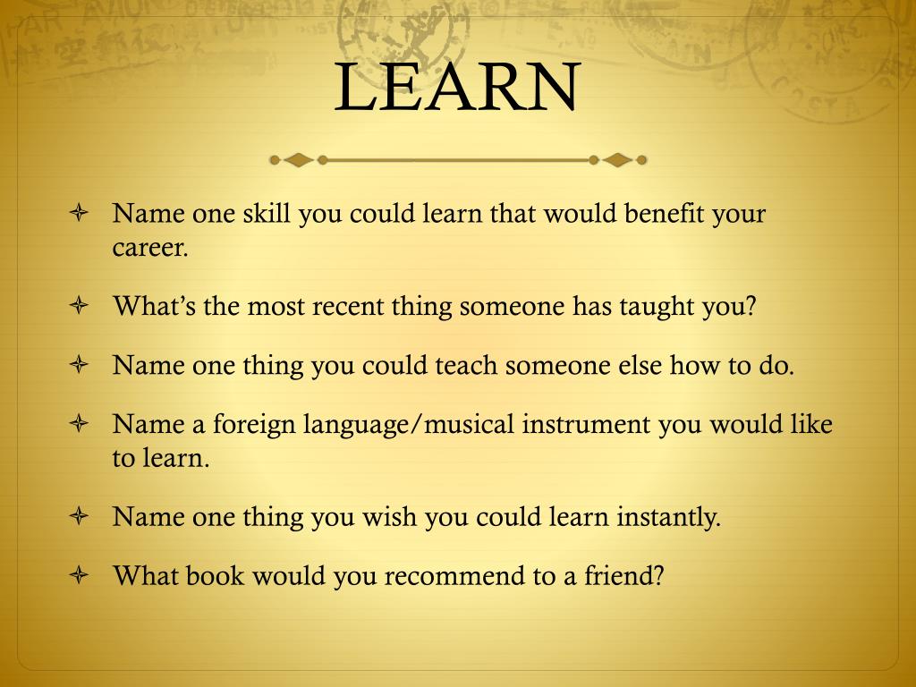 LEARN Name one skill you could learn that would benefit your career. What’s the most recent thing someone has taught you? Name one thing you could teach someone else how to do. Name a foreign language/musical instrument you would like to learn. Name one thing you wish you could learn instantly. What book would you recommend to a friend?