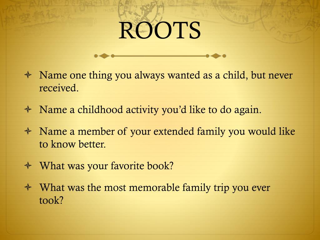 ROOTS Name one thing you always wanted as a child, but never received. Name a childhood activity you’d like to do again. Name a member of your extended family you would like to know better. What was your favorite book? What was the most memorable family trip you ever took?