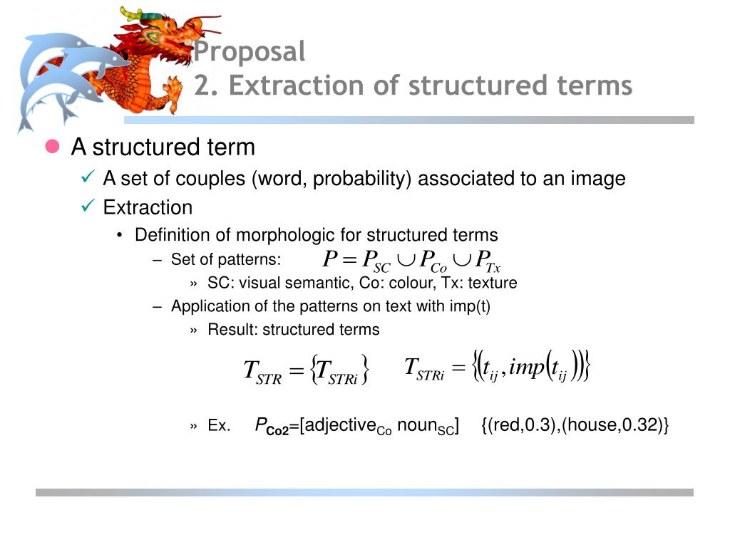 Proposal2. Extraction of structured terms • A structured term • A set of couples (word, probability) associated to an image • Extraction • Definition of morphologic for structured terms • Set of patterns: • SC: visual semantic, Co: colour, Tx: texture • Application of the patterns on text with imp(t) • Result: structured terms • Ex. PCo2=[adjectiveConounSC] {(red,0.3),(house,0.32)}