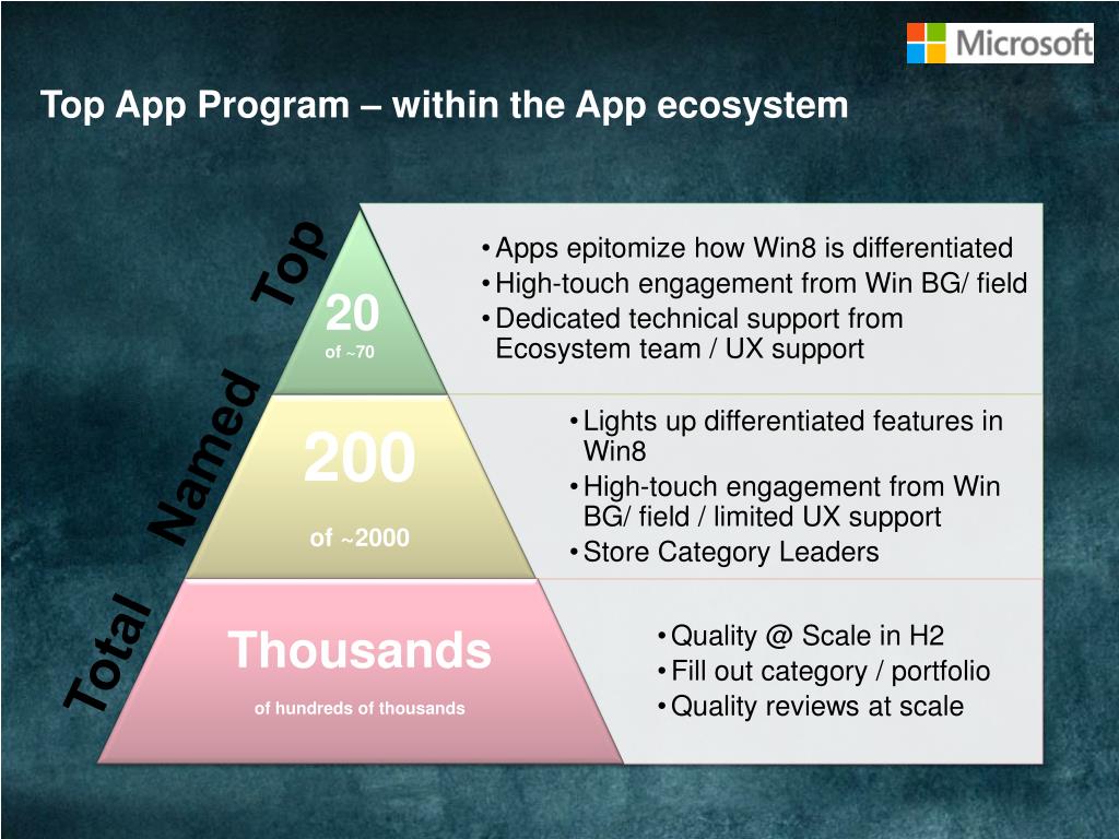 Top App Program – within the App ecosystem • Apps epitomize how Win8 is differentiated • High-touch engagement from Win BG/ field • Dedicated technical support from Ecosystem team / UX support Top • 20 • of ~70 • Lights up differentiated features in Win8 • High-touch engagement from Win BG/ field / limited UX support • Store Category Leaders 200 of ~2000 Named • Quality @ Scale in H2 • Fill out category / portfolio • Quality reviews at scale Thousands of hundreds of thousands Total