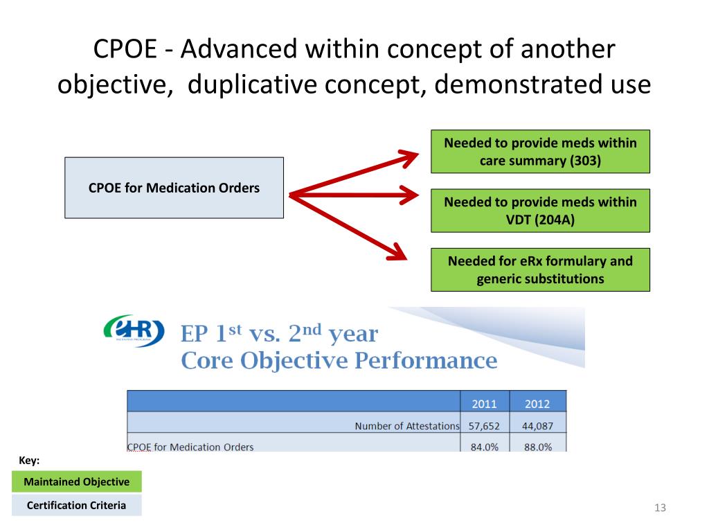 CPOE - Advanced within concept of another objective, duplicative concept, demonstrated use Needed to provide meds within care summary (303) CPOE for Medication Orders Needed to provide meds within VDT (204A) Needed for eRx formulary and generic substitutions Key: Maintained Objective Certification Criteria