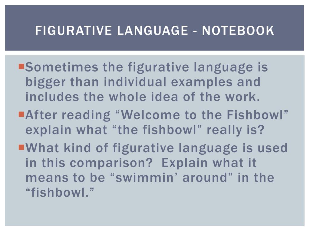 FIGURATIVE LANGUAGE - NOTEBOOK • Sometimes the figurative language is bigger than individual examples and includes the whole idea of the work. • After reading “Welcome to the Fishbowl” explain what “the fishbowl” really is? • What kind of figurative language is used in this comparison? Explain what it means to be “swimmin’ around” in the “fishbowl.”