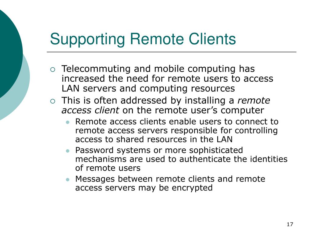 Supporting Remote Clients • Telecommuting and mobile computing has increased the need for remote users to access LAN servers and computing resources • This is often addressed by installing a remote access client on the remote user’s computer • Remote access clients enable users to connect to remote access servers responsible for controlling access to shared resources in the LAN • Password systems or more sophisticated mechanisms are used to authenticate the identities of remote users • Messages between remote clients and remote access servers may be encrypted