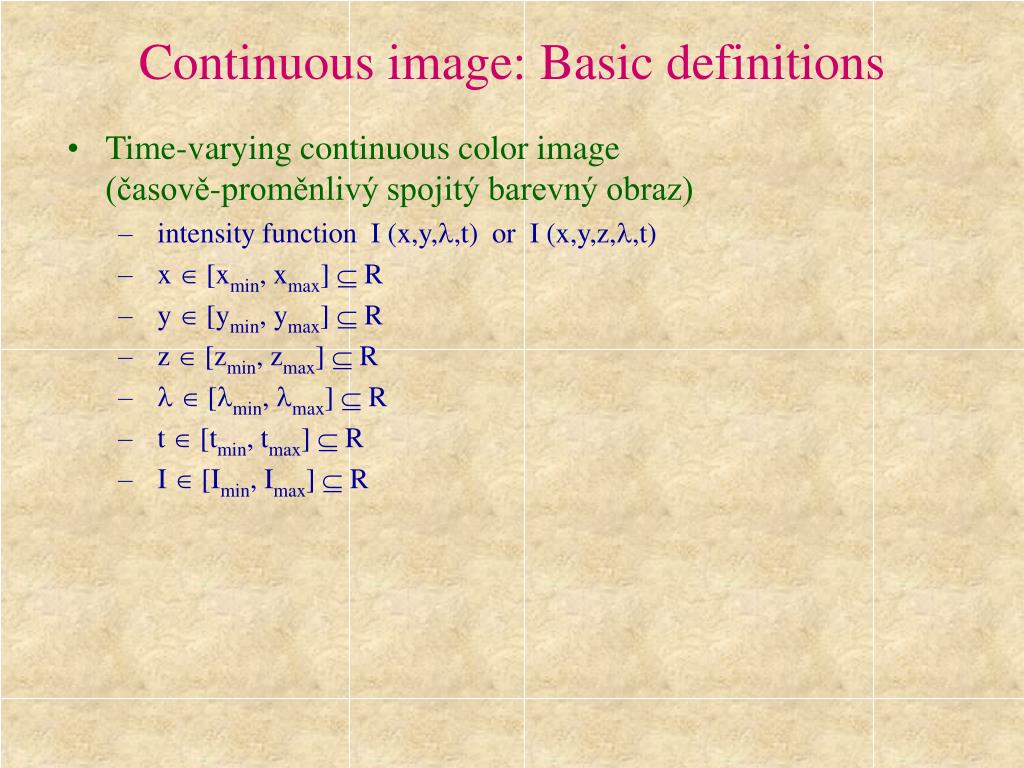Continuous image: Basic definitions • Time-varying continuous color image(časově-proměnlivý spojitý barevný obraz) • intensity function I (x,y,l,t) or I (x,y,z,l,t) • x Î [xmin, xmax] Í R • y Î [ymin, ymax] Í R • z Î [zmin, zmax] Í R • l Î [lmin, lmax] Í R • t Î [tmin, tmax] Í R • I Î [Imin, Imax] Í R