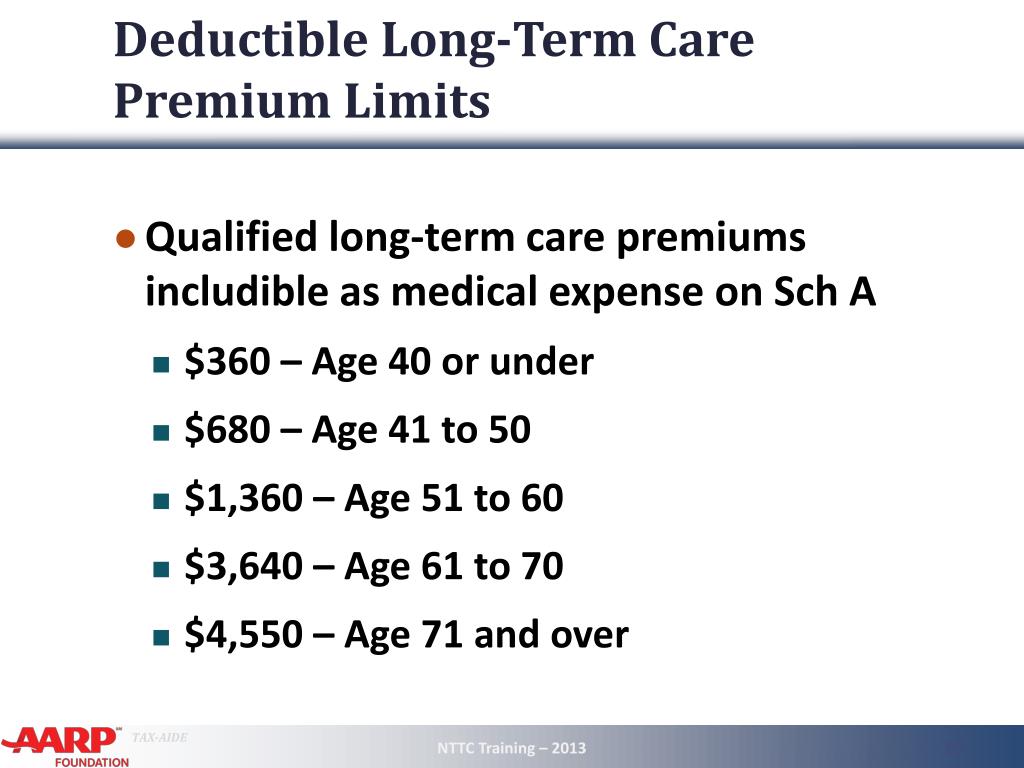 Deductible Long-Term Care Premium Limits • Qualified long-term care premiums includible as medical expense on Sch A • $360 – Age 40 or under • $680 – Age 41 to 50 • $1,360 – Age 51 to 60 • $3,640 – Age 61 to 70 • $4,550 – Age 71 and over NTTC Training – 2013 10