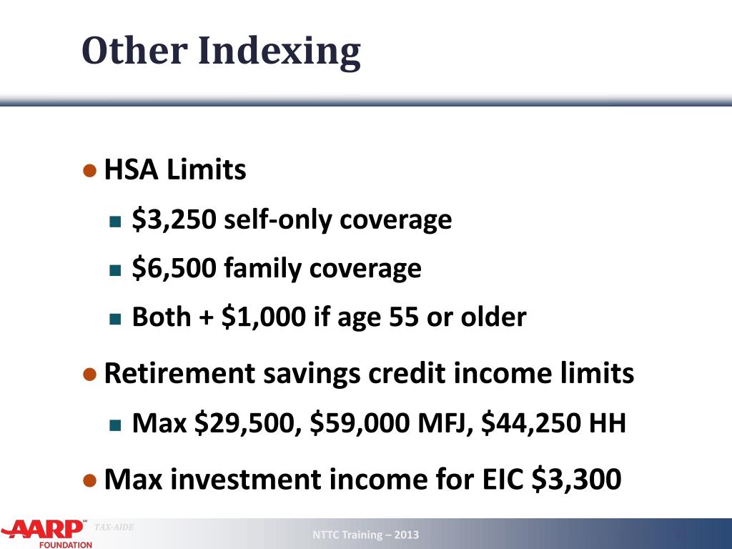 Other Indexing • HSA Limits • $3,250 self-only coverage • $6,500 family coverage • Both + $1,000 if age 55 or older • Retirement savings credit income limits • Max $29,500, $59,000 MFJ, $44,250 HH • Max investment income for EIC $3,300 NTTC Training – 2013 11