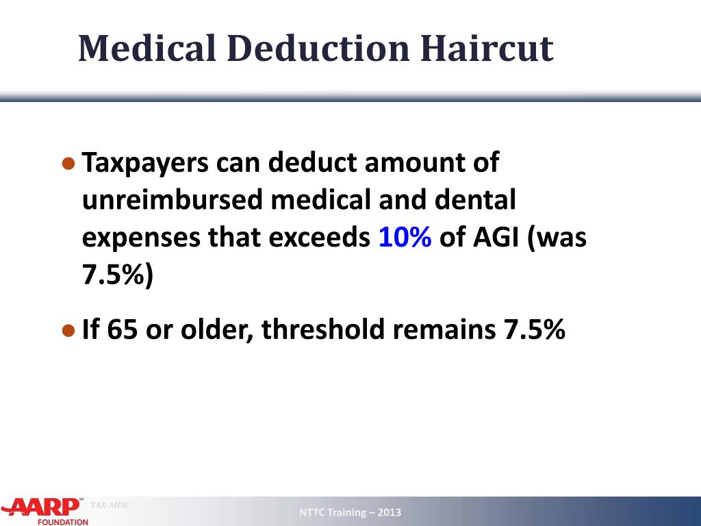 Medical Deduction Haircut • Taxpayers can deduct amount of unreimbursed medical and dental expenses that exceeds 10%of AGI (was 7.5%) • If 65 or older, threshold remains 7.5% NTTC Training – 2013 3