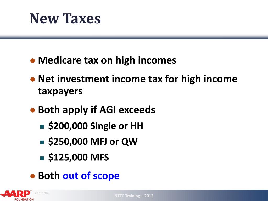 New Taxes • Medicare tax on high incomes • Net investment income tax for high income taxpayers • Both apply if AGI exceeds • $200,000 Single or HH • $250,000 MFJ or QW • $125,000 MFS • Both out of scope NTTC Training – 2013 5