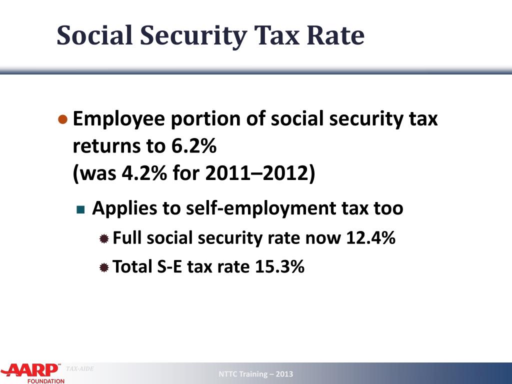 Social Security Tax Rate • Employee portion of social security tax returns to 6.2% (was 4.2% for 2011–2012) • Applies to self-employment tax too • Full social security rate now 12.4% • Total S-E tax rate 15.3% NTTC Training – 2013 6