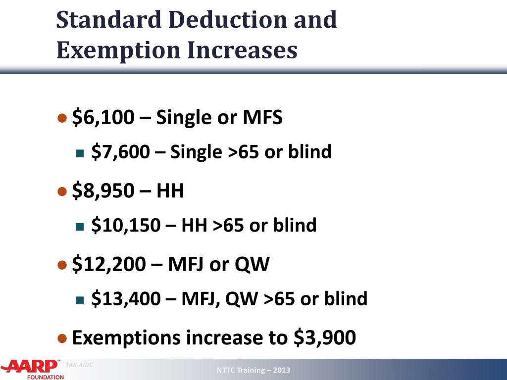 Standard Deduction and Exemption Increases • $6,100 – Single or MFS • $7,600 – Single >65 or blind • $8,950 – HH • $10,150 – HH >65 or blind • $12,200 – MFJ or QW • $13,400 – MFJ, QW >65 or blind • Exemptions increase to $3,900 NTTC Training – 2013 7