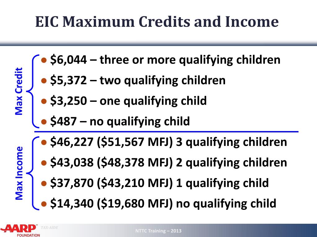 EIC Maximum Credits and Income • $6,044 – three or more qualifying children • $5,372 – two qualifying children • $3,250 – one qualifying child • $487 – no qualifying child • $46,227 ($51,567 MFJ) 3 qualifying children • $43,038 ($48,378 MFJ) 2 qualifying children • $37,870 ($43,210 MFJ) 1 qualifying child • $14,340 ($19,680 MFJ) no qualifying child NTTC Training – 2013 9