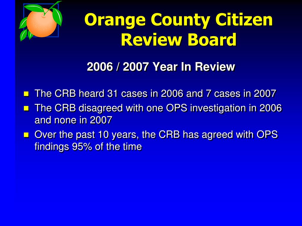 Orange County Citizen Review Board 2006 / 2007 Year In Review • The CRB heard 31 cases in 2006 and 7 cases in 2007 • The CRB disagreed with one OPS investigation in 2006 and none in 2007 • Over the past 10 years, the CRB has agreed with OPS findings 95% of the time