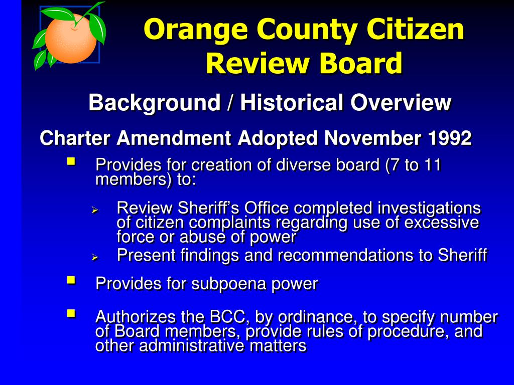 Orange County Citizen Review Board Background / Historical Overview Charter Amendment Adopted November 1992 • Provides for creation of diverse board (7 to 11 members) to: • Review Sheriff’s Office completed investigations of citizen complaints regarding use of excessive force or abuse of power • Present findings and recommendations to Sheriff • Provides for subpoena power • Authorizes the BCC, by ordinance, to specify number of Board members, provide rules of procedure, and other administrative matters