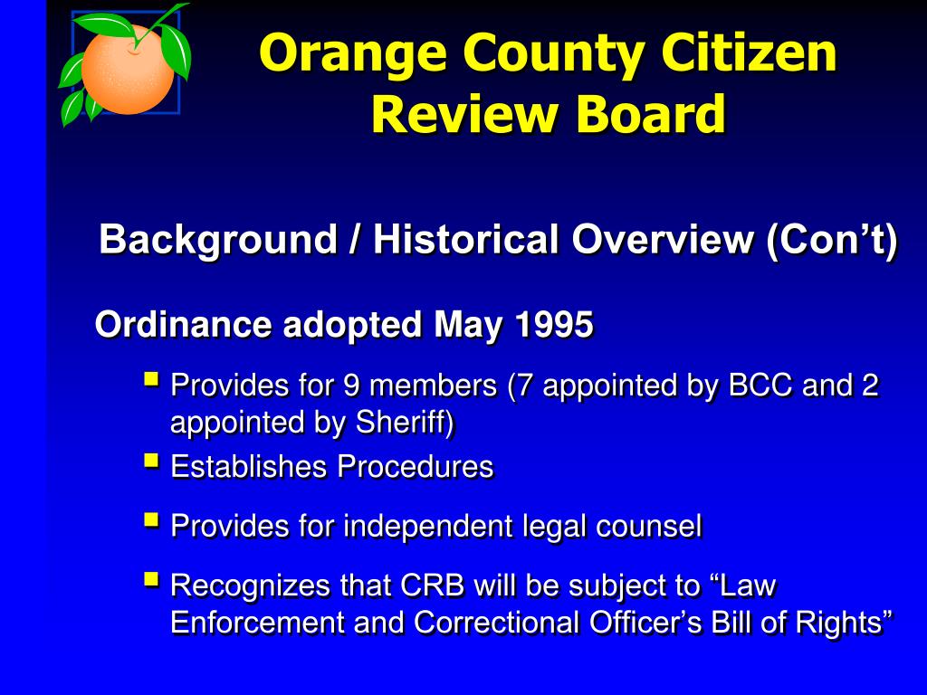 Orange County Citizen Review Board Background / Historical Overview (Con’t) Ordinance adopted May 1995 • Provides for 9 members (7 appointed by BCC and 2 appointed by Sheriff) • Establishes Procedures • Provides for independent legal counsel • Recognizes that CRB will be subject to “Law Enforcement and Correctional Officer’s Bill of Rights”