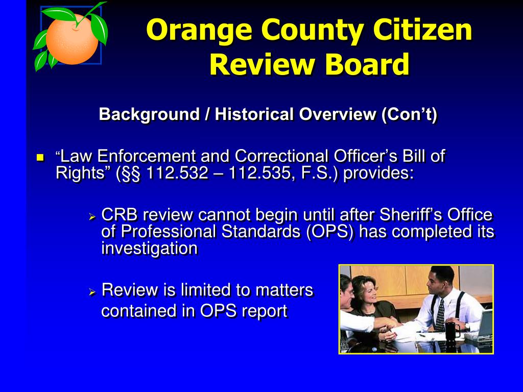 Orange County Citizen Review Board Background / Historical Overview (Con’t) • “Law Enforcement and Correctional Officer’s Bill of Rights” (§§ 112.532 – 112.535, F.S.) provides: • CRB review cannot begin until after Sheriff’s Office of Professional Standards (OPS) has completed its investigation • Review is limited to matters contained in OPS report