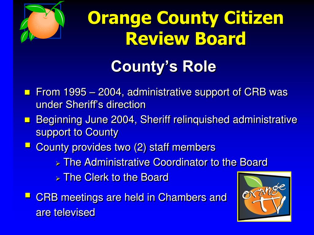 Orange County Citizen Review Board County’s Role • From 1995 – 2004, administrative support of CRB was under Sheriff’s direction • Beginning June 2004, Sheriff relinquished administrative support to County • County provides two (2) staff members • The Administrative Coordinator to the Board • The Clerk to the Board • CRB meetings are held in Chambers and are televised