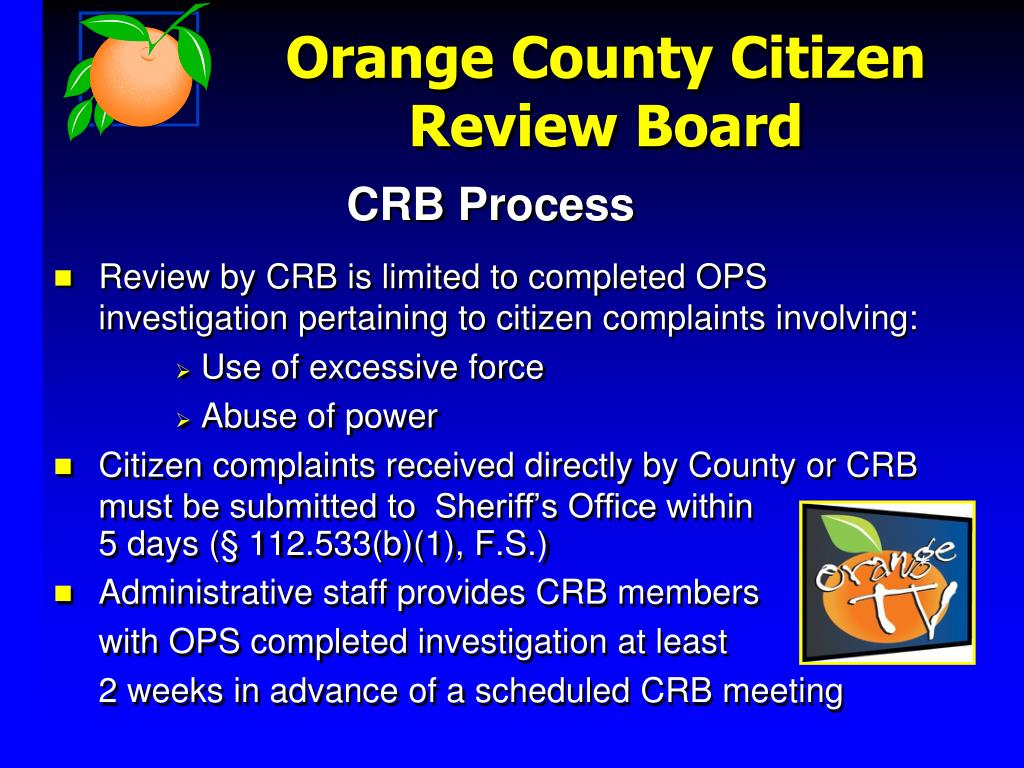 Orange County Citizen Review Board CRB Process • Review by CRB is limited to completed OPS investigation pertaining to citizen complaints involving: • Use of excessive force • Abuse of power • Citizen complaints received directly by County or CRB must be submitted to Sheriff’s Office within 5 days (§ 112.533(b)(1), F.S.) • Administrative staff provides CRB members with OPS completed investigation at least 2 weeks in advance of a scheduled CRB meeting